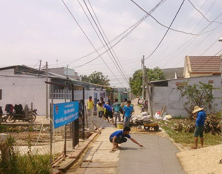 Sinh viên chương trình Thứ 7 tình nguyện đang bê tông hóa đường giao thông nông thôn tại xã Phước Kiển, huyện Nhà Bè