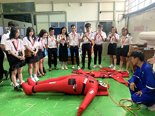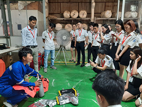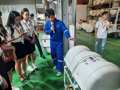 Các bạn đã được tham quan kho chứa các trang thiết bị dịch vụ của Công ty GOTCO. Ngoài ra các sinh viên còn được tham quan sàn bè, tìm hiểu về những trang thiết bị cứu sinh tại GOTCO. Tại đây mọi người đã được sử dụng và trải nghiệm thực tế với những trang thiết bị cứu sinh trên tàu. Cùng nhau đặt ra những câu hỏi, thắc mắc của mình và được kỹ thuật viên giải đáp một cách tận tình và chi tiết.