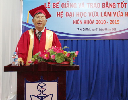 Phát biểu tại buổi lễ, PGS, TS Nguyễn Bá Hoàng, Phó Hiệu trưởng nhà trường đã chúc mừng các tân cử nhân đồng thời gửi lời cám ơn gia đình, cơ quan nơi sinh viên công tác đã tạo điều kiện, ủng hộ và giúp đỡ các bạn để có thể học tập và hoàn thành khóa học. Hy vọng các bạn sẽ tiếp tục công tác tốt để làm rạng rỡ thêm bảng thành tích của trường.