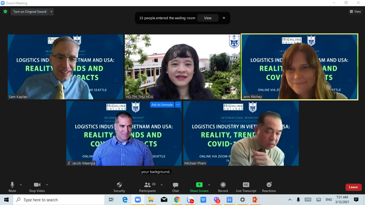 Đại diện Highline College ThS Shawna Freeman Lane chia sẻ về chương trình đào tạo định hướng ứng dụng “Global Trade & Logistics” của Khoa Kinh doanh và cơ hội thực tập on-job-training của sinh viên tại các tập đoàn: Boeing, Port of Seattle, Amazon….