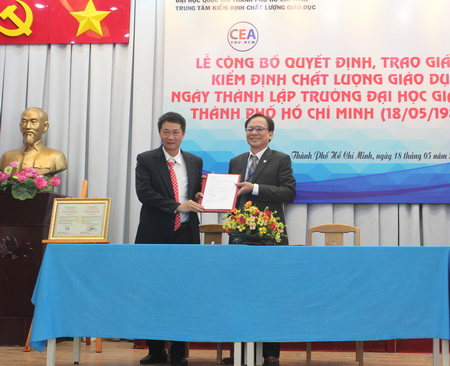 Đại diện Trung tâm Kiểm định chất lượng giáo dục trao quyết định và giấy chứng nhận cho Trường