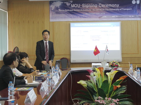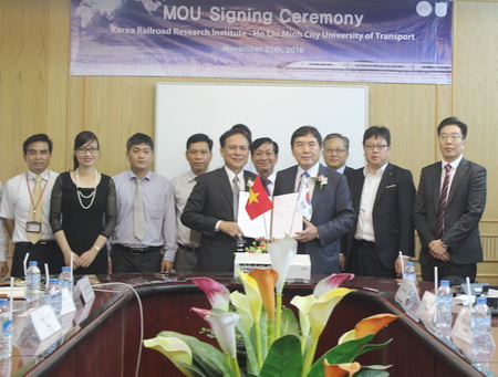 PGS.TS Nguyễn Văn Thư, Hiệu trưởng Nhà trường và ông KIM Ki Hwan – Viện trưởng Viện Nghiên cứu Đường sắt Hàn Quốc KRRI đã cùng ký biên bản ghi nhớ, hứa hẹn nhiều cơ hội hợp tác, phát triển mối quan hệ tốt đẹp của hai bên.