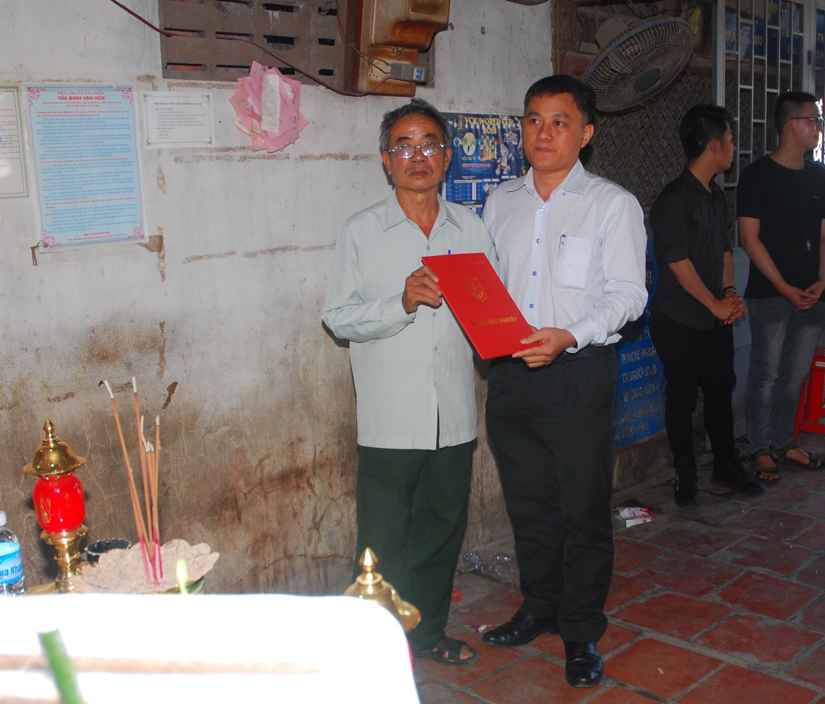 TS. Trần Thiện Lưu, Trưởng phòng Đào tạo đồng thời là giảng viên hướng dẫn đồ án cho sinh viên Hải, đại diện Nhà trường trao bằng tốt nghiệp cho gia đình của sinh viên Hải