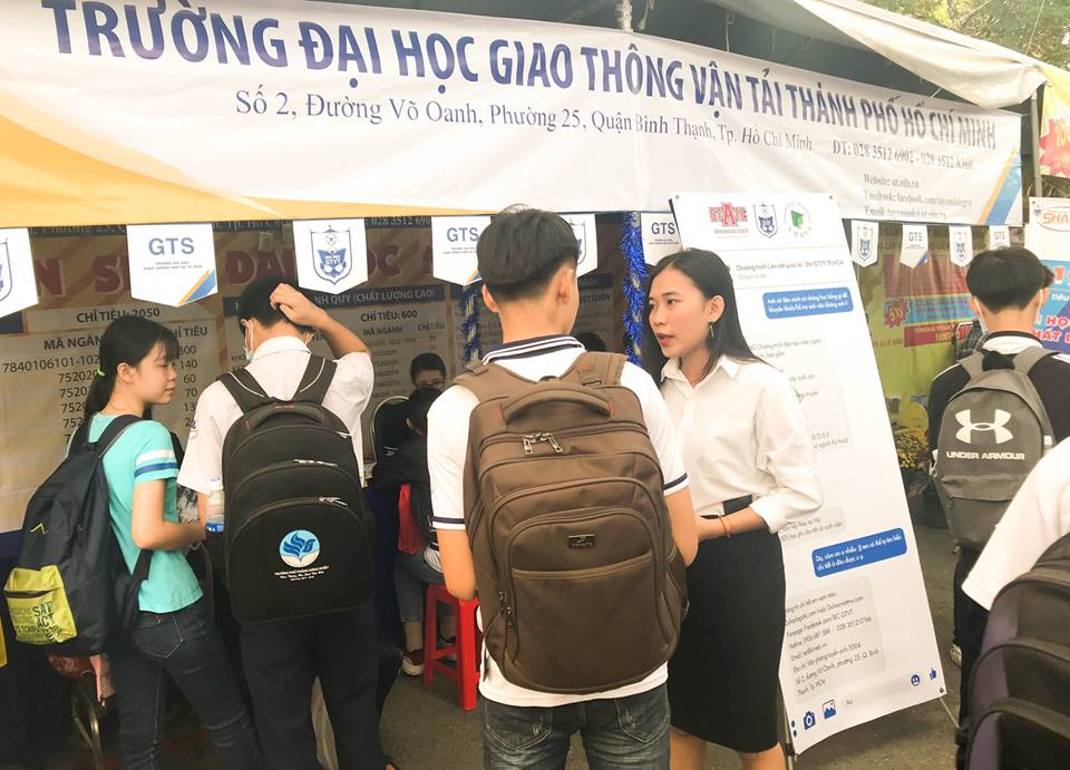 Vẫn như mọi năm, gian hàng tư vấn trường ĐH Giao thông vận tải TP.HCM luôn thu hút rất nhiều quý thầy cô, phụ huynh và học sinh ghé tham quan và đặt nhiều câu hỏi quan tâm về trường. Cán bộ tư vấn tuyển sinh của Nhà trường liên tục trả lời tất cả thắc mắc của quý thầy cô, phụ huynh và học sinh THPT tham dự ngày hội liên quan đến thông tin các ngành đào tạo, chỉ tiêu, phương thức xét tuyển, điểm chuẩn các năm, học phí, thủ tục nộp hồ sơ xét tuyển vào trường, cơ hội nhận học bổng và cơ hội việc làm sau khi ra trường,....