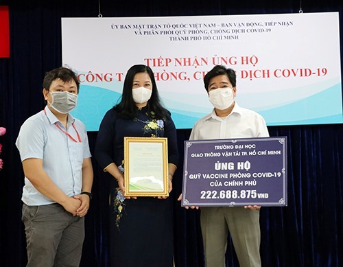 Năm 2021 cũng là năm đại dịch Covid-19 bùng phát, mỗi viên chức, người lao động và người học Trường ĐH Giao thông vận tải TP.HCM ở bất cứ vị trí nào, công việc nào đều chung tay, truyền cho nhau những thông điệp tích cực, ý nghĩa, để “luôn bình tĩnh, không hoang mang, giữ niềm tin, chung sức mạnh”. Bằng những hành động nhanh chóng và thiết thực, Nhà trường đã phát động, kêu gọi viên chức, người lao động và người học đóng góp ủng hộ “Quỹ vắc xin phòng Covid-19" của Chính phủ, triển khai thành công chiến dịch tiêm văc-xin ngừa Covid-19 cho toàn thể viên chức, người lao động Trường.