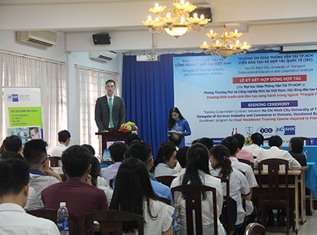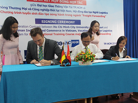 Đây là chương trình đào tạo song hành theo chuẩn DIHK CHLB Đức, nơi sinh viên sẽ học lý thuyết 50% thời gian của chương trình tại Đại học GTVT TP. HCM, 50% thời gian còn lại sẽ thực hành tại các công ty vận tải quốc tế của Đức như Công ty a. Hartrodt logistics Vietnam Co., Ldt, Công ty Bolloré Logistics Vietnam, Công ty Karl Gross Logistics Vietnam, Công ty Logwin Air + Ocean Vietnam Co., Ldt, Công ty Schenker Vietnam Co., Ldt, Công ty Shipco Transport Vietnam Ldt, Công ty Weiss-Rohlig Vietnam Ldt, Công ty Geodis Wilson Vietnam Co. Ldt, Công ty Indo Trans Corporations (ITL). Sau thời gian đào tạo 4 năm tại Trường Đại học Giao thông vận tải TP.HCM và được tuyển chọn tham gia chương trình đào tạo song hành trong Ngành “Freight Forwarding” sinh viên sẽ nhận được bằng Đại học do Trường Đại học Giao thông vận tải TP.HCM cấp và bằng chứng chỉ của GIC/AHK Việt Nam được DIHK Đức công nhận. Học viên sẽ nhận được khoản trợ cấp hàng tháng từ phía các doanh nghiệp logistics quốc tế này trong suốt quá trình học. Ngay sau buổi ký kết, chương trình tuyển sinh và phỏng vấn sinh viên của các công ty logistics quốc tế chính thức diễn ra.