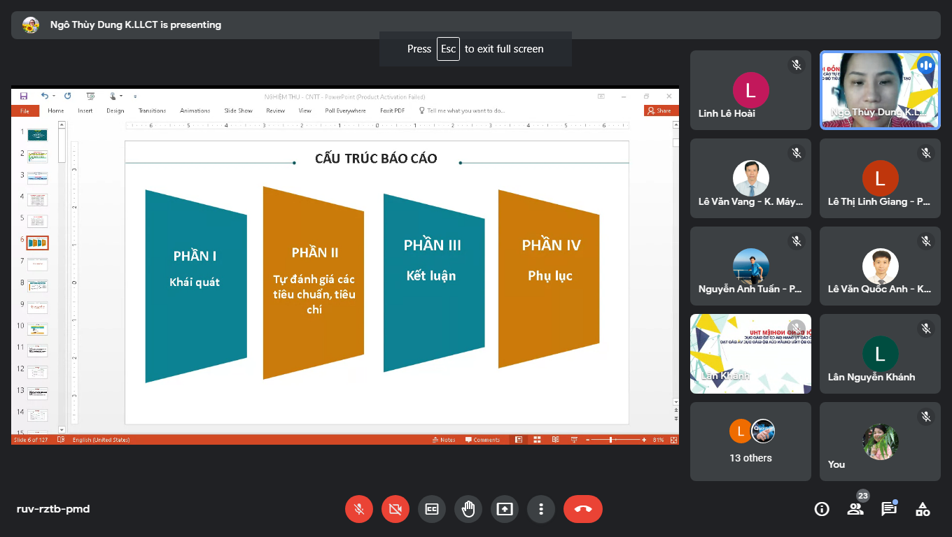 Cấu trúc của báo cáo tự đánh giá CTĐT ngành CNTT bao gồm có 04 phần: Khái quát, Tự đánh giá (11 tiêu chuẩn), Phần Kết luận và phần Phụ lục. Đại diện nhóm báo cáo đã trình bày nội dung chính của báo cáo tự đánh giá tập trung vào Phần II Tự đánh giá. Trong đó, mỗi tiêu chí đánh giá CTĐT được tiến hành theo trình tự như sau: Mô tả thực trạng, Điểm mạnh, Điểm tồn tại: Kế hoạch hành động, Tự đánh giá: theo các mức độ đạt yêu cầu của tiêu chí từ mức 1 đến mức 7.