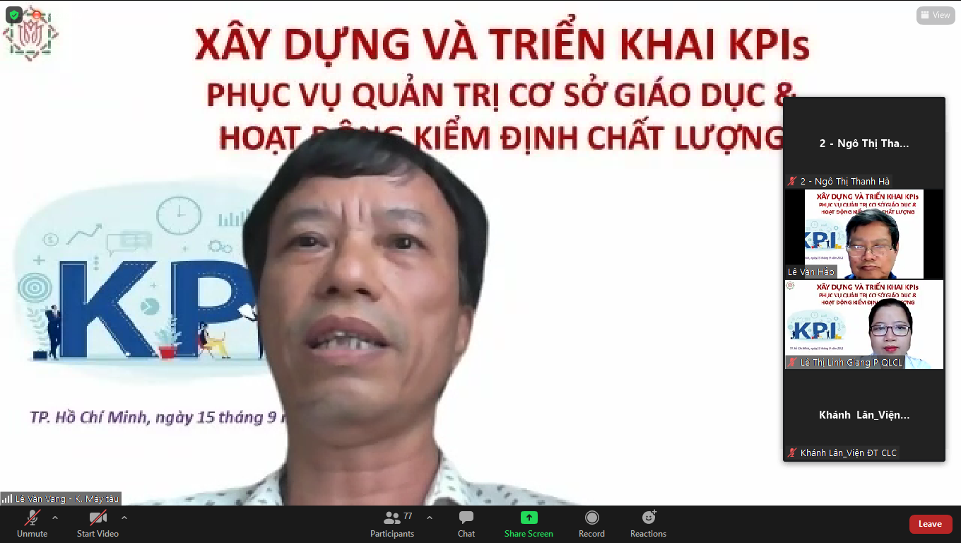 PGS.TS Lê Văn Hảo, chuyên gia tư vấn BĐCLGD trình bày về “Xây dựng và triển khai KPIs phục vụ quản trị cơ sở giáo dục & hoạt động kiểm định chất lượng”. Các đại biểu đã được nghe về KPIs và các khái niệm liên quan, cách xây dựng KPIs nhằm triển khai Chiến lược và kế hoạch hàng năm của Trường nhằm giúp cải tiến công tác quản trị CSGD, góp phần đáp ứng yêu cầu các bộ tiêu chuẩn đánh giá chất lượng CSGD và CTĐT.