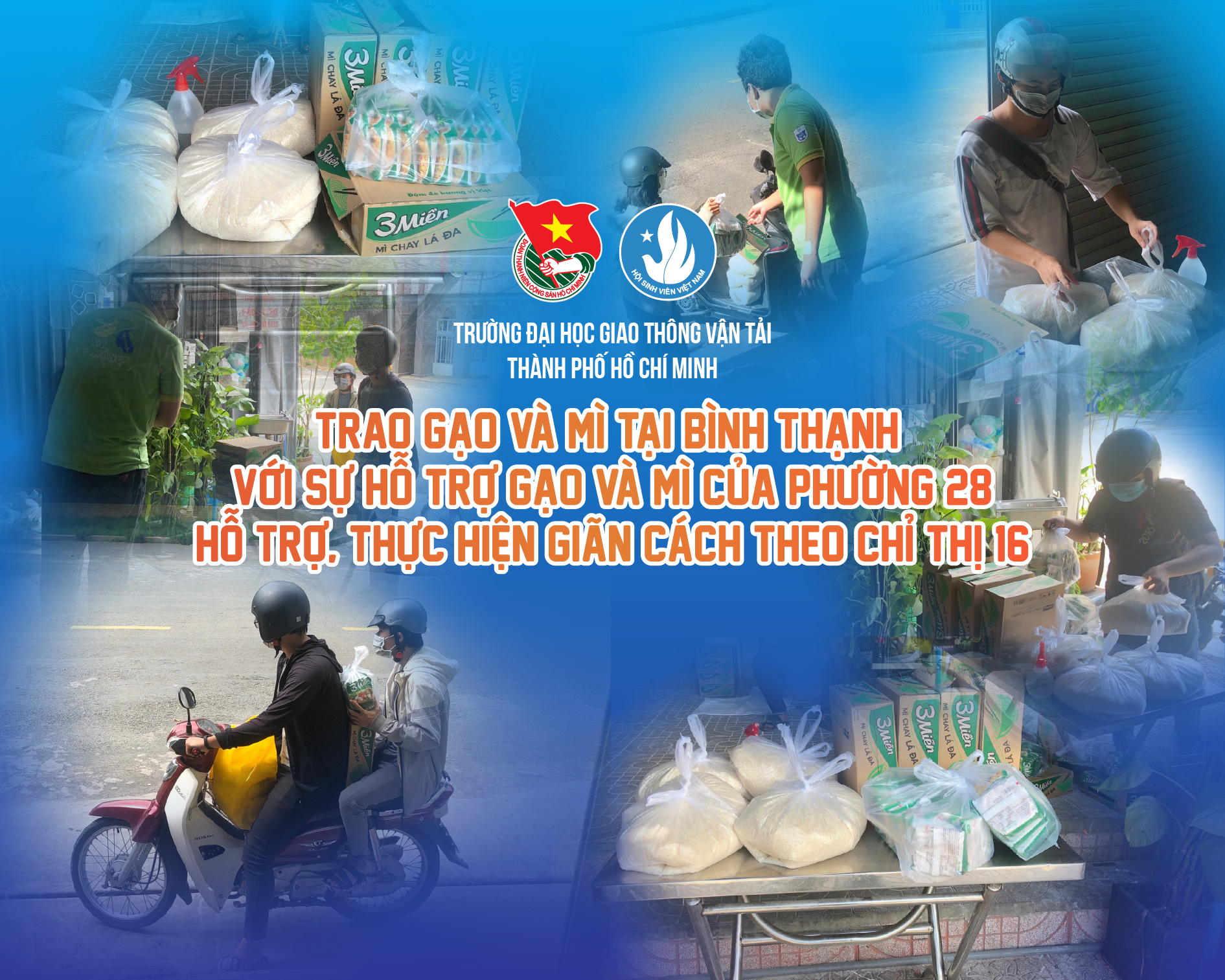 Đoàn Thanh niên - Hội Sinh viên Trường ĐH Giao thông vận tải TP.HCM cũng đã phối hợp cùng Đoàn Phường 28 (Quận Bình Thạnh), Đoàn Phường Tân Chánh Hiệp (Quận 12) và các mạnh thường quân nhằm đồng hành, giúp sinh viên vững lòng vượt qua mùa dịch.