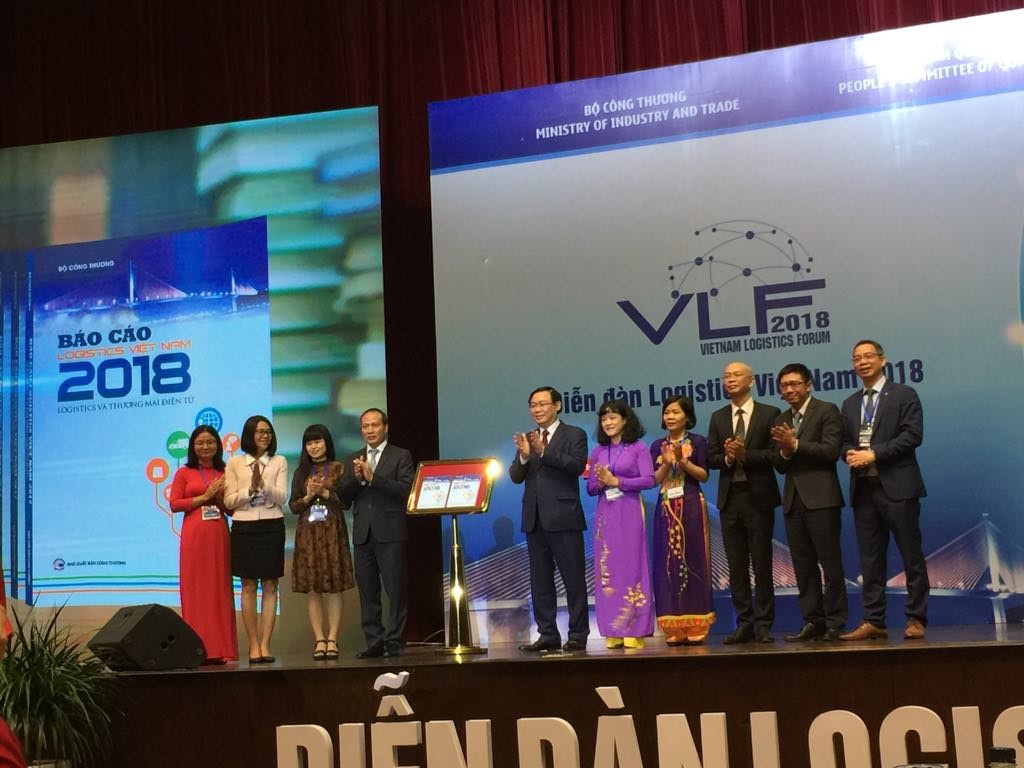 Phó thủ tướng Vương Đình Huệ và Thứ trưởng Bộ Công Thương, ông Cao Quốc Hưng cùng toàn thể ban biên tập công bố “Báo cáo Logistics Việt Nam 2018”